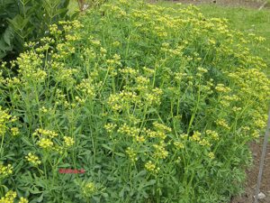 püstine vars on väheharunev, alumises osas puitunud. Liitlehed on kahelisulgjalt jagunenud ja lehekeste kuju on laimunajas kuni ümar. Nii lehed kui vars on sinakasrohelised. Õitseb juuni-juulis kollakasroheliste kuni 2cm läbimõõduga õitega varre ja okste tippudes. Õitseaeg pikeneb, kui taime kärpida (lõigata maha äraõitsenud õitega varte osad). Tuntuim sort on ‘Jackman’s Blue’, mis erineb liigist intensiivsema sinaka värvusega ja madalama, kuni 60 cm, kompaktsema kasvuga.