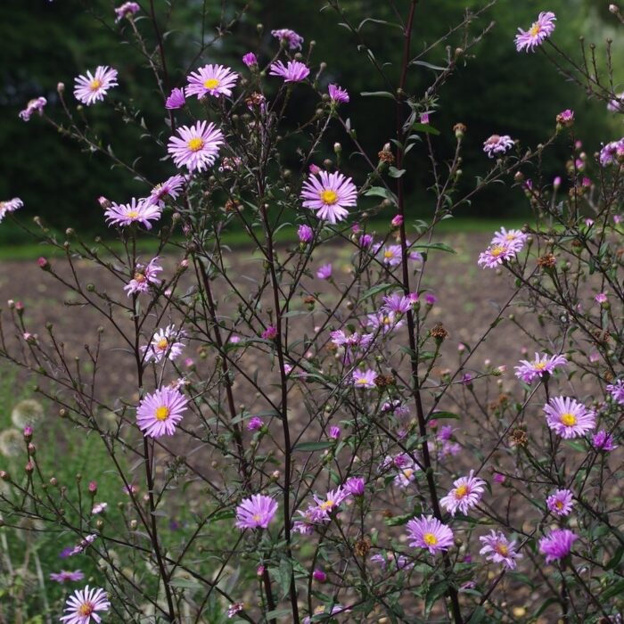 Symphyotrichum laeve ‘Glow in the Dark’ Formally Aster ‘Glow in the Dark’ A must have for your garden. Slender black stems and very dark almost black leaves contrast beautifully with the luminous lilac pink flowers that do really glow in the dark at twilight. Grow in sun and well drained soil. Divide every third year to maintain vigour. Supplied as a garden ready plant in a 9x9x10cm pot.